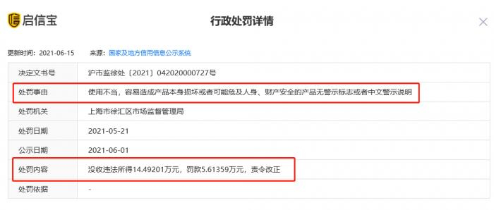 启信宝显示,2021年6月15日,宜家电子商务(中国)有限公司新增一条行政处罚,处罚事由为可能危及人身、财产安全的产品无警示标志或者中文警示说明,产品警示标志经抽检判定为不合格;处罚结果为没收违法所得14.49201万元,罚款5.61359万元,责令改正;处罚单位为上海市徐汇区市场监督管理局。
