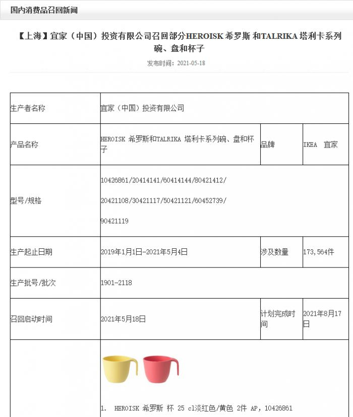 2021年5月18日,宜家因为旗下HEROISK希罗斯和TALRIKA塔利卡系列碗、盘和杯子存在缺陷,召回餐具17.36万件,为公司史上最大规模产品召回。