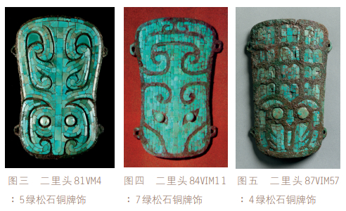 一种演变途径是作为一种器物形制的演变,即绿松石龙形器这一器物的演变。如二里头等遗址发现的绿松石铜牌饰所表现的演变形式,即由二里头二期的 02VM3 ∶ 5绿松石龙形器演变为二里头二期晚段的 81VM4 ∶ 5绿松石铜牌饰(图三)、再演变为二里头四期的84VIM11 ∶ 7绿松石铜牌饰(图四),以及同样是二里头四期的87VIM57 ∶ 4绿松石铜牌饰(图五)。二里头遗址绿松石铜牌饰都出自墓葬中,而且都与绿松石龙形器一样,有铜铃伴出,表明二里头遗址出土的绿松石铜牌饰的使用功能应与绿松石龙形器相同。