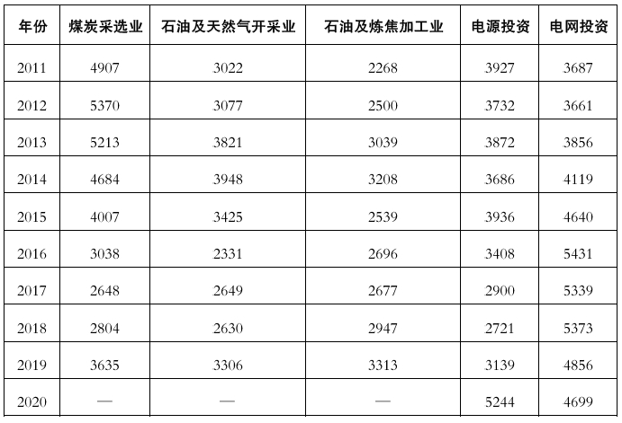 表1-5 2011~2020年能源行业固定资产投资(不含农户)(单位:亿元)