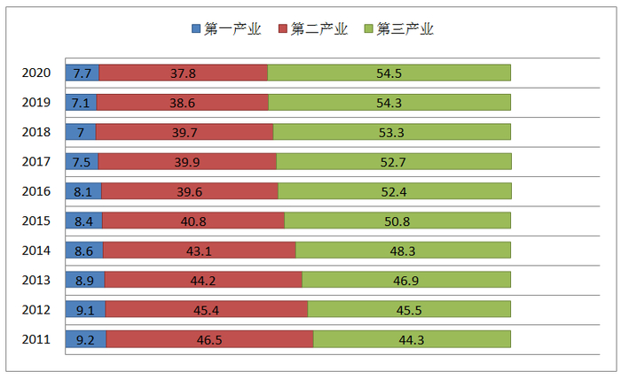 从占比看,2020年第一产业增加值占国内生产总值比重为7.7%,较上年增加0.6个百分点,第二产业增加值比重为37.8%,较上年下降0.8个百分点,第三产业增加值比重为54.5%,比上年提高0.2个百分点。