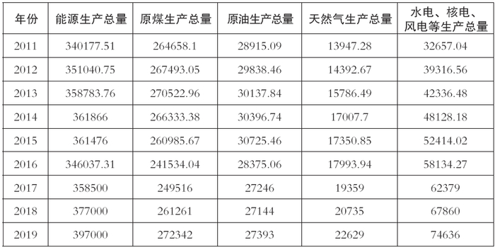 表1-2 2011~2019年一次能源生产情况(单位:万吨标准煤)