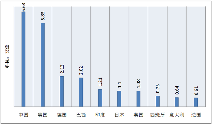 我国非水可再生能源消费同样居于世界首位,2019年为6.63艾焦,超过第二名美国0.8艾焦,是第三名德国的3倍多。