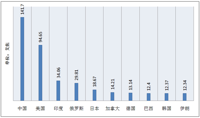 据2020年《BP世界能源统计年鉴》,2019年中国一次能源消费总量为141.7艾焦,居于世界首位,其次为美国94.65艾焦,印度、俄罗斯分别以34.06、29.81艾焦居于第三、四名,欧洲总计为83.82艾焦。