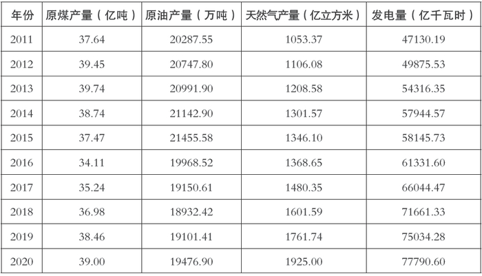 表1-1 2011~2020年主要能源品种生产总量