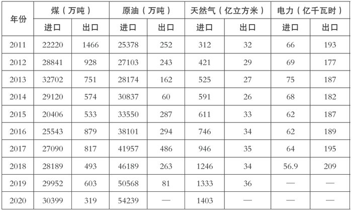 表1-3 2011~2020年我国能源进出口情况