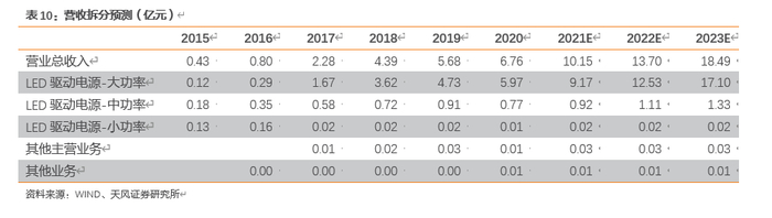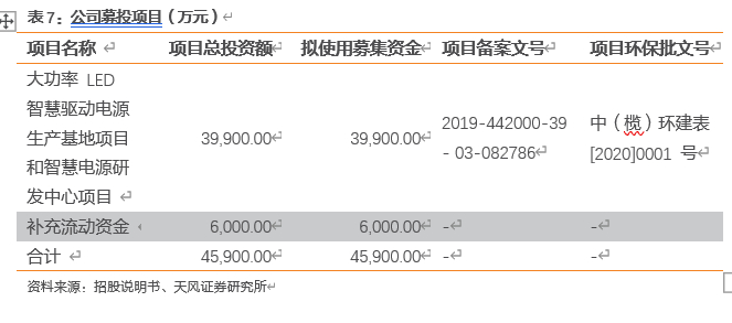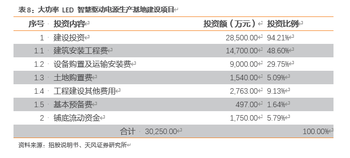 公司拟建设智慧电源研发中心项目,该项目定位于建成国内先进的集技术研发、产品检测为一体的研发中心,成为公司新技术、新产品、新业务领域的储备基地、创新基地和检测基地,为公司的持续发展提供源动力。该项目将主要开展符合LED驱动电源主流发展趋势的技术研究和产品开发,项目建成后,将进一步提升公司在技术、研发、品质等方面的核心竞争力,同时不断探索、拓展公司核心产品的应用领域,为公司实现进阶发展提供新的增长极。表9:建设智慧电源研发中心项目资料来源:招股说明书、天风证券研究所