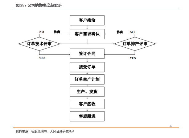 公司的销售活动主要由业务部负责,研发部、制造部负责协助完成。业务部负责与客户的商务接洽,包括客户询价、建立客户档案、明晰合作模式、确认订单需求等,并将客户需求分别提交至研发部和制造部;研发部进行订单技术评审,制造部进行订单排产评审,并将评审结果反馈至业务部。对于未通过订单技术评审的订单,业务部及时与客户协商并说明原因;对于研发部和制造部评审通过的订单,业务部再次与客户确认产品型号、报价等信息,向客户提供样品,并与客户签订合同后完成生产订单转换。生产发货后,业务部负责后续客户的货物签收确认、协助提供发票开具信息、收回货款等,并在订单完结后负责售后管理。