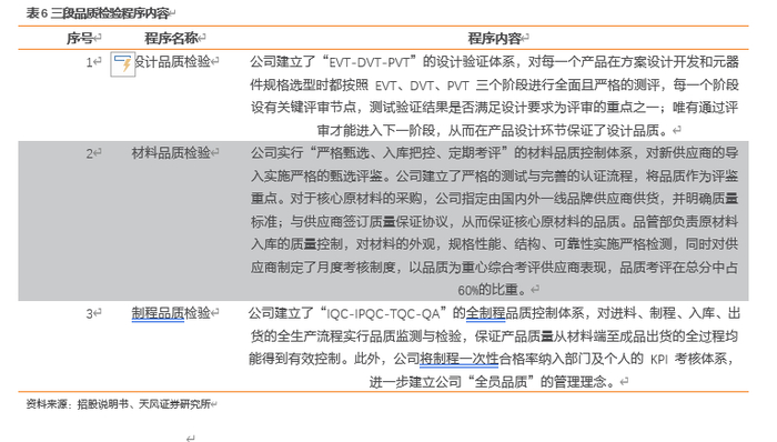 为了保证产品质量,公司将产品的质量管控贯穿研发、采购、生产、仓储、销售、服务等全过程,并依靠制度体系、人才资源及硬件设施的保障,保证了产品品质的持续稳定性。公司产品在市场拥有良好的口碑,公司曾获评“深圳市质量强市骨干企业”公司建立了完善的产品质量控制体系,围绕客户满意度、制程一次性通过率和产品准时交付率等指标构建了有效的总体质量目标体系。在具体质量控制措施方面,公司实行了“设计—材料—制程”三段品质检验程序。公司将质量控制目标和理念贯穿于公司研发、采购、生产、仓储、销售等各环节,并制定了《质量目标控制程序》、《设计与开发控制程序》、《生产过程控制程序》、《品质检验控制程序》、《不合格品输出控制程序》、《产品识别与追溯管理程序》、《事故报告、调查与处理控制程序》、《环境有害物质控制程序》、《仓储管理程序》等质量控制制度。同时,公司还建立了将制程品质、生产效率、交付能力以及成本管控指标与个人月度薪酬激励挂钩的多维度 KPI 绩效管理体系,从而在制度建立、过程执行及控制反馈等前、中、后端环节有效保证产品的品质稳定性。