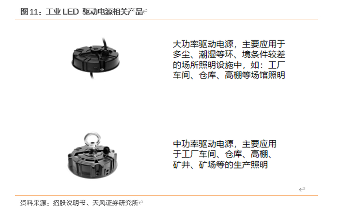 公司所主营的 LED 驱动电源产品主要是与 LED 光源、壳体等配套组合成为LED 照明产品,其主要功能是把外部电源供应转换为特定的电压电流以驱动LED 照明产品发光并进行相应的控制。LED 驱动电源是 LED 照明产品的核心部件,对 LED 照明产品实现发光和控制功能,提升发光效率,控制系统功耗,保证产品的稳定、可靠和长使用寿命起关键作用。公司 LED 驱动产品涵盖 10W-760W 区间的范围,按产品的功率范围划分,可以分为大功率、中功率和小功率三种类型。根据产品应用领域的不同,公司 LED驱动电源产品分为户外 LED 驱动电源、工业 LED 驱动电源以及其他 LED 驱动电源产品.