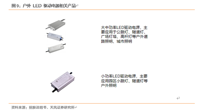 户外 LED 驱动电源产品是公司主营业务的核心产品之一,主要应用于公路灯、隧道灯、高杆灯、投射灯等大型户外功能性照明设施,以大功率和中功率产品为主,少量的小功率产品主要应用于园区内小路灯、隧道灯等小型户外照明设施。公司户外照明驱动电源产品种类丰富,涵盖 20W-760W 功率范围区间,能满足市场主流户外照明灯具的需求,可以稳定运行于高温、低温、雨雪、风沙、雷击、盐雾等各种复杂的户外自然环境,公司部分产品还兼具可编程智能控制、多种智能调光的功能。
