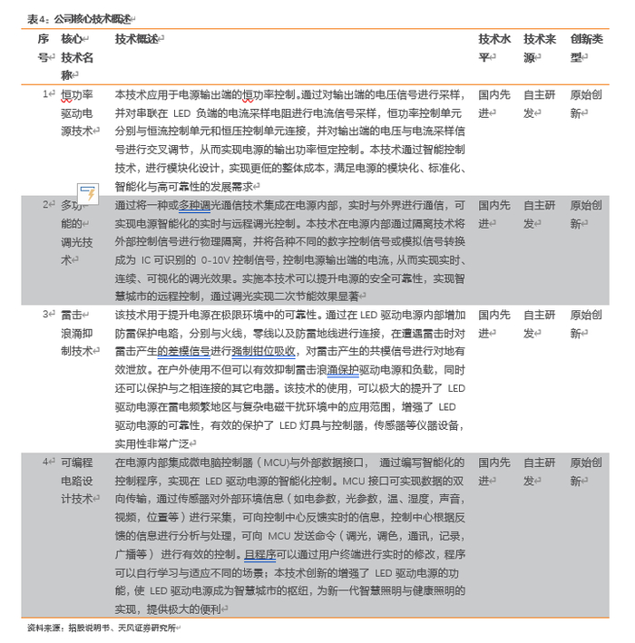 公司是国家认定的高新技术企业,并通过了深圳市企业技术中心、广东省工程技术研究中心的认定。截至 2020 年 12 月 31 日,公司及子公司拥有已授权专利117 项,其中发明专利 17 项,实用新型专利 96 项,外观设计专利 4 项,同时公司还参与《照明用 LED 驱动电源技术要求》T/CECS 10021-2019、《直流照明系统技术规程》T/CECS 705-2020 等行业标准的编制工作。公司自主掌握 LED 驱动电源的恒功率驱动技术、多功能的调光技术、雷击浪涌抑制技术、可编程技术等多项核心技术。公司产品采用先进的电路技术、结合在材料和结构上的创新,保证了产品在转换效率、功率因素、THD、防水、防雷、高低温、电磁兼容、寿命等方面的高性能。同时,公司产品兼容多国的安规认证,取得了包括国内 CCC 和境外 UL、ENEC、TUV、SAA、KC、BIS 等合计超过 250 项的产品认证证书。围绕户外道路照明和工矿照明两大应用领域,公司现已形成 29 个系列、超 300 个畅销产品型号,主要的中大功率产品覆盖 25W-760W 的功率范围,针对工矿照明就有 9 个系列可选,是工矿照明 LED 驱动电源领域产品规格高度齐全的品牌之一;公司的产品布局可覆盖户外道路照明和工矿照明的大多数应用,为公司相对全面的市场覆盖奠定了坚实的基础。