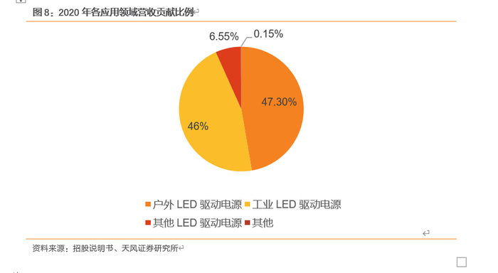公司的终端产品广泛应用于城市路桥、高速公路、隧道、机场等大型户外LED照明设施,以及工业厂房、仓库等LED工业照明设施,同时正向植物照明等新兴应用领域拓展。如下图所示,截止2020年,公司的营收仍旧主要来自于户外和工业LED驱动电源的销售贡献。