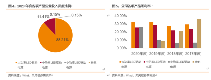 公司LED驱动电源产品占总营收比例高达99.85%。其中,大功率LED驱动电源占比最高,达到总营收的88.21%。