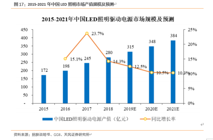 在全球范围内各国对LED照明的积极推广和政策支持下,LED照明逐渐成为刚需,全球和中国LED驱动电源市场在经历高增长阶段后仍呈现出良好的发展态势。根据高工产研LED研究所(GGII)统计,2018 年全球LED照明产值规模达到6,010亿元,同比增长 12.1%,继续保持快速增长的势头,预计到2021年全球LED照明行业市场规模有望超过7,980亿元;2018年中国 LED 照明产值规模达到 4,155 亿元,同比增长13.9%,预计2021年将达到5,900亿元。在全球LED照明市场的带动下,2018年全球 LED 驱动电源市场规模达到403亿元,同比增长10.1%,预计2021年将达到535亿元;作为全球最大的LED照明市场,2018年中国LED驱动电源产值规模达280亿元,同比增长14.3%,预计2021年有望达到384亿元。通过实施该项目,新增LED驱动电源产能有利于公司扩充产能实力,充分把握LED驱动电源行业发展机遇,从而进一步扩大公司经营规模,增强公司盈利能力,进而有利于进一步巩固并提高公司的行业地位。