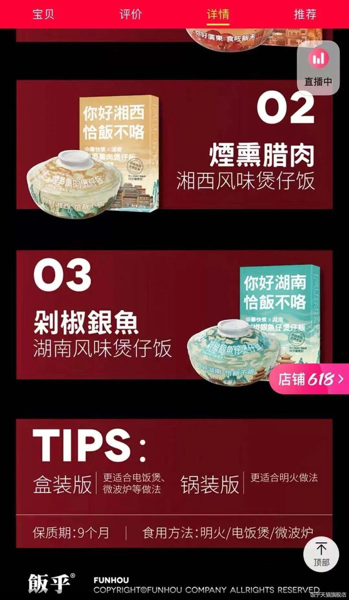饭乎已经上线的产品为快煮煲仔饭,15分钟即可煮一锅带锅巴的煲仔饭,并且已经实现了明火、微波炉、电饭煲、电磁炉等不同方式的标准化烹饪。目前,饭乎推出的产品有腊味三宝煲仔饭、烟熏腊肉煲仔饭以及剁椒小银鱼煲仔饭,还在开发的口味有宣威火腿煲仔饭云南风味以及四川风味。在淘宝上销量最高的是广式腊味砂锅煲仔饭,月销量为8000多份,带砂锅的价格约在28元/盒,不带砂锅的价格约23元/盒。