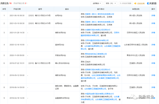 但根据天眼查来看,森龙橡胶的经营情况一直堪忧,从2018年开始,森龙橡胶就因为多次涉及金融借款合同纠纷被告上法庭,其中原告大部分是银行,包括了日照银行股份有限公司五莲支行、中国民生银行股份有限公司青岛分行、招商银行股份有限公司日照分行、交通银行股份有限公司日照分行等,由此可见森龙橡胶的资金链很早就出现了问题。