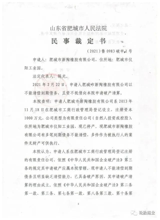 肥城市新陶橡胶有限公司的破产裁定书,且资不抵债向法院申请破产清算。住所地为肥城市仪阳工业园,现已停产。现肥城市多笔到期债务不能清偿,多件作为被执行人案件无财产可执行。