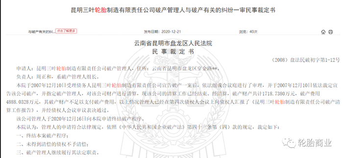 在破产中,最老的轮胎企业当属昆明三叶轮胎,成立于1984年。经清算,破产财产共计1718.7380万元,破产费用4888.0328万元,其破产财产不足以支付破产费用,以上情况管理人已经在第四次债权人会议上向债权人汇报了《昆明三叶轮胎制造有限责任公司破产清算工作报告》,并经债权人会议审议表决通过。该公司管理人于2020年12月16日向本院申请终结破产程序。