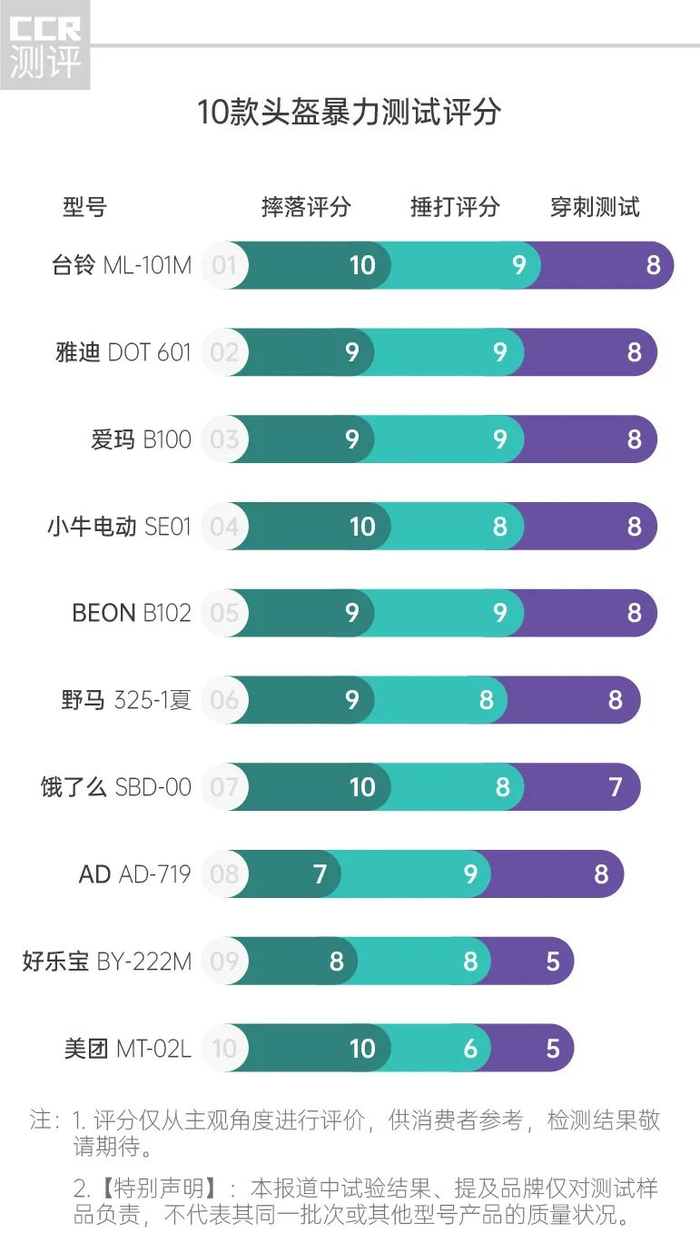 2021年3月,《消费者报道》选购了10款电动车夏天头盔,对其进行测试比较,品牌包括美团、饿了么、雅迪、爱玛、小牛电动、台铃、AD、野马、好乐宝、BEON。