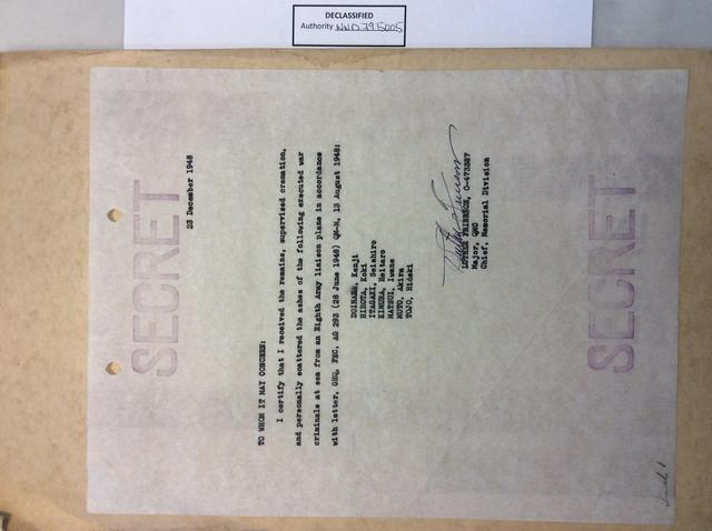根据日本共同社的报道,高泽弘明看到的其中一份档案标注的日期是1948年12月23日,即7名战犯被处决当日,另一份档案的日期为1949年1月4日。当年的现场负责人、美军少校卢瑟·弗瑞森(Luther Frierson)详细记录了处决这批战犯及处理尸体的工作。