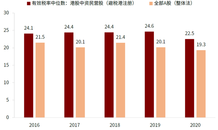 对于这部分公司而言,其大陆子运营实体所产生的利润仍需缴纳25%的企业所得税,与上文中相同,但若有其他海外利润,这一部分利润则无需完全按照国内较高的所得税缴纳。那么全球最低税率对这一部分会有多大影响?以海外中资股集中的港股市场为样本来看,95%港股中资民营企业(不含红筹股和H股)的注册地位于开曼群岛和百慕大两个离岸避税港。不过,大多中国民营企业选择注册在海外并非为了避税,而可能更是为了方便在境外上市,或为简化跨国业务税收制度。从实际产生的有效税率来看,注册于全球避税港的香港民营股有效税率平均反而还高于A股整体。2020年港股中资民营股平均有效税率为22.5%,仅小幅低于25%的法定税率。这也说明海外注册的中资企业缴税与大陆注册的企业并没有本质上的区别。