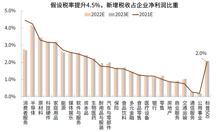 不过实际的直接影响相对有限。我们以两种假设进行测算。其一,以当前美国海外收入最低税率10.5%为标准,将海外利润税收提升4.5%;其二,以爱尔兰所得税率12.5%为标准,将海外利润税收提升2.5%。由于无法获得企业各地域收入真实利润率数据,我们假定企业海外收入利润率和公司整体利润率一致,并假定未来海外收入占比不变,同时使用2019前企业税前利润率数据和海外收入占比进行计算以避免疫情干扰,由此得出对净利润影响的估算:1)企业海外所得税率提升4.5%,2021年预计影响标普500净利润340亿美元左右,占标普500净利润总额2%。2)企业海外所得税率提升2.5%,2021年预计影响标普500净利润189亿美元左右,占标普500净利润总额1.1%。3)分行业看,消费者服务、半导体和原材料受到最大影响。因此,不难看出,由于税率的变化并不显著,因此整体的影响相对有限。