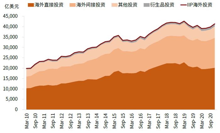 图表:中国香港外资投资头寸达40万亿美元,其中直接投资占了一半以上