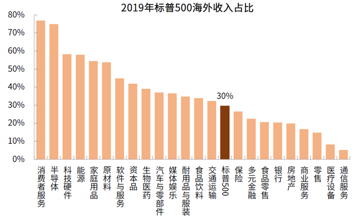 图表:标普500整体海外收入占比30%,分板块看消费者服务、半导体和科技硬件占比最高