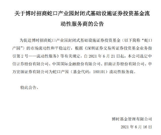 而博时基金也宣布,选定中信证券、中金公司、招商证券、申万宏源为蛇口产园的流动性服务商。