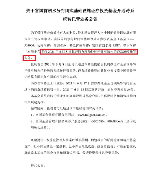 据富国首创水务REIT公告,为向投资者提供更优质的服务,基金管理人向中国证券登记结算有限责任公司提出申请,自 2021年6月8日起开通本基金场外转托管至场内业务。为办理本基金上市业务。