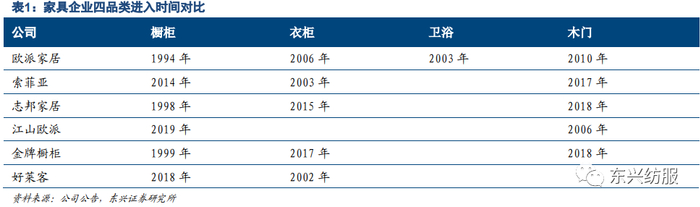 橱柜龙头其他品类布局领先行业,具有先发优势。欧派成立于1994年,成立初首先进入橱柜制造领域,之后分别于2003年进入整体卫浴领域,于2005 年进入整体衣柜领域,于2010 年进入定制木门领域,是最早进行多品类布局的家具企业。目前公司分按业务分为七大事业部:欧派橱柜、欧派衣柜(全屋定制)、欧铂尼木门、欧派卫浴、欧派大宗业务、欧铂丽全屋定制、整装大家居。由于各品类业务均布局较早,因此公司在布局初期能享受到行业红利,并有充足时间打通渠道体系,打磨制造工艺。
