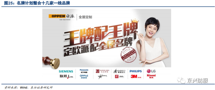 欧派自身品类丰富,叠加强大资源整合能力,有望打造全品类整装。整装相对于全包的优势即是给予消费者更丰富的品类选择以及一站式的服务。在定制家具方面,欧派有丰富的设计经验,可以给予消费者足够的款式选择,而对于其他产品,公司也展现了较强的外部资源整合能力:2019年,欧派曾在广州试点 “名牌计划”,以欧派为主导,整合西门子、松下、飞利浦、LG、3M、慕思、圣象、东鹏瓷砖、欧普照明等十几家一线品牌,实现主材、定制家具、软装配套、灯饰寝具、家电家品一站配齐,28天内实现销售额3250万元。我们认为公司有望凭借自身品牌在定制家居行业的地位,以及整装渠道布局的先发优势,实现真正的全品类整装,获得更强的渠道优势。
