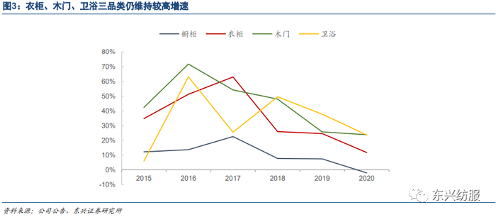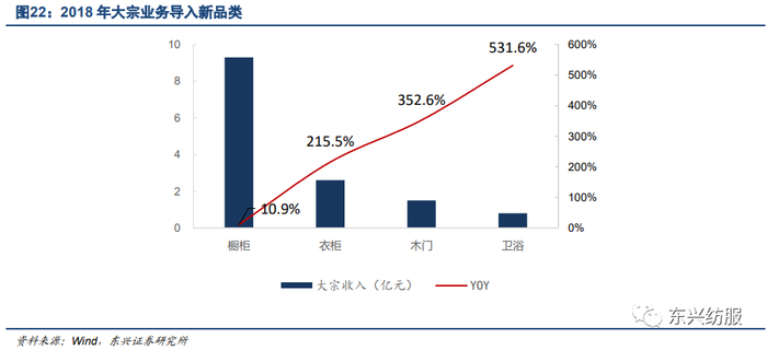 大宗业务导入新品类,拉动公司多品类发展。欧派最初通过橱柜业务切入大宗业务,2018年逐步借助已形成的公司良好品牌,进一步导入衣柜、木门、卫浴和金属门窗等品类。2018年衣柜、木门、卫浴同比增速达到215.5%、352.6%、531.6%。我们认为公司在大宗业务上的快速发展,拉动了公司新品类的增长,同时,新品类也将成为公司未来大宗业务上的主要增长点。