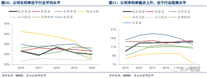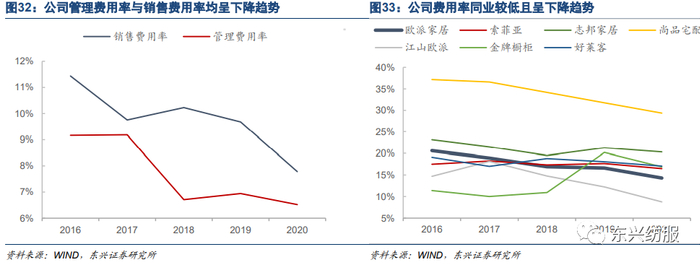 净利率稳步上升,保持行业高位。公司在2015年以前通过低价打开市场,尤其是衣柜业务,随着业务的成熟,公司开始上调毛利率,因此净利率与毛利率均在2016年有较大的提升。2017-2020年公司毛利率分别为34.52%、38.38%、35.84%、35.01%,处于行业平均水平;净利率分别为13.38%、13.66%、13.59%、13.99%,处于行业较高水平。在毛利率保持平均水平,且研发费用保持高水平的前提下,我们认为公司有如此优秀的净利率源自于较好的费用控制能力。