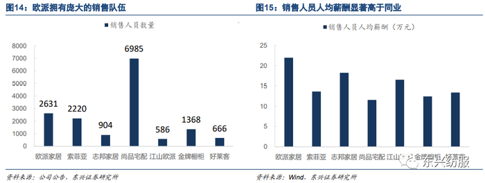 高激励打造高素质销售队伍。公司一直以来重视销售人才方面的投入,通过高激励吸引优秀销售人员,激发主观能动性。2020年,公司旗下销售人员达到2631人,除去以自营为主的尚品宅配以外,公司销售队伍规模同业最大。同时,公司销售人员平均薪酬高于同类企业。我们认为家居行业的产品差异化不足,尤其是面向工程等渠道的产品,单价较低,同质化严重,高活力的销售队伍将会对渠道与品类的拓展产生关键性作用。