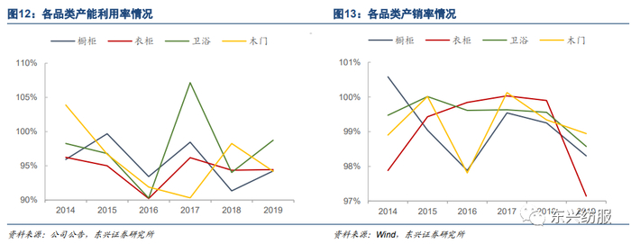 产能释放节奏优异,产能利用率维持高位。2019年橱柜、衣柜、卫浴、木门年产产能分别为74万套、176万套、39万套、61万樘。从2014年到2019年间,产能逐步释放,各品类产能利用率维持90%以上,产销率维持95%以上,两指标均维持高位。公司稳健的产能释放,支撑了业务发展,也对毛利率的稳定提供有利支撑。
