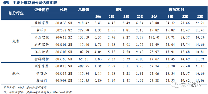 整装是未来明确的发展模式。整装渠道是前移的家居流量入口:定制家居公司可以从装修链的最前端获取客户;同时整装也是家居公司提高客单价的不二法门:公司可以销售多品类产品,并且还可以从供应链整合获取利润。因此整装是家居公司非常理想的扩展方式。对家装公司来说,整装同样契合自身利益:1)整装解决了以往家装公司在制作定制家居上的难点。2)整装套餐价格更高,家装公司能获得更高的利益。3)家装公司也可获取定制家居公司的流量。结合当前消费者偏好省心的消费趋势,我们认为在生产端和消费端的共振下,整装渠道是家居公司未来比较明确的发展道路。