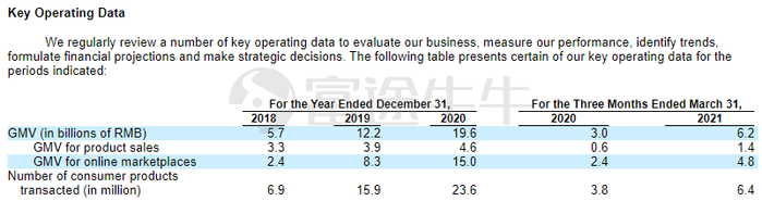 交易规模方面来看,截至2020年12月31日止年度,平台上交易的GMV总额为196亿元人民币,在平台上交易的消费产品数量超过2360万件,与截至2019年12月31日止年度相比,分别同比增长60.7%和48.4%。截至2021年3月31日的12个月,在公司平台上交易的总GMV为228亿元人民币,在公司平台上交易的消费产品数量为2610万件,分别同比增长66.1%和46.6%。截至2021年3月31日的三个月,在公司平台上交易的总GMV为62亿元人民币,在公司平台上交易的消费产品数量为640万件,分别同比增长106.7%和68.4%。
