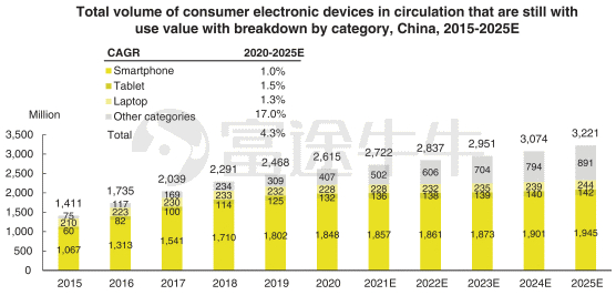 此外,中国市场因移动互联网的内容种类更多,如直播、短视频和游戏,用户的屏幕时间比世界平均水平要长。因此,在中国流通的消费类电子设备的数量庞大且不断增加。据CIC估计,2020年中国仍有使用价值的流通消费类电子设备达26.154亿台,是美国8.687亿台的3.0倍,预计到2025年,这一数量将增长到32.213亿台。
