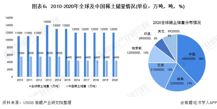 我国对稀土采取开采总量控制措施。根据最新数据显示,2020年我国稀土矿产量为14万吨,占全球稀土矿总产量的一半以上。