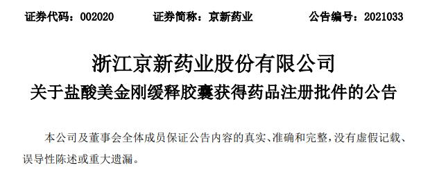 6月15日,京新药业公告称,近日收到国家药监局核准签发的化学药品“盐酸美金刚缓释胶囊”【规格28mg】的《药品注册证书》,同时视为通过仿制药质量和疗效一致性评价。