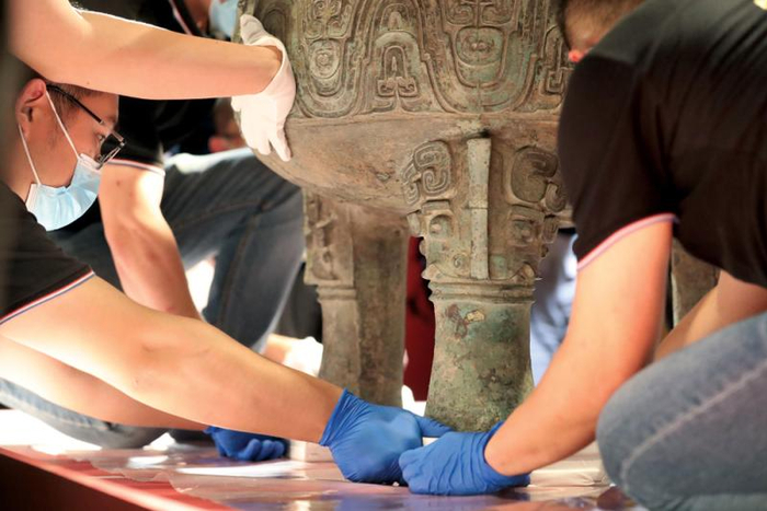18时58分,大克鼎先被工作人员通过细长的滑板移动至展台之上,随后轻抬鼎身,将三足之下的细长滑板换成等高的三层正方形滑板,最终“定位”。19时3分,工作人员开始逐一抽掉9块滑板,每次抽掉最后一块滑板时,同步将塑料薄膜一并剪开撤掉,终于在19时12分让大克鼎再次“脚踏实地”。“看起来只是抽掉十几厘米见方的滑板,但下手需要果断,要‘快抽慢放’,每次大克鼎蹄足部移动,不超过1厘米。”据悉,整个运输路程数百米,耗时1个多小时,但大克鼎的实际移动距离只以厘米计算。