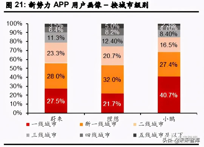 新势力 APP 用户的地理分布方面,小鹏汽车在一线城市(41%)和新一线城市拥有更多用 户。蔚来汽车和理想汽车两家新势力都在中国的二线城市积累了一定的用户群。展望未来, 我们认为三大新势力将继续扩大其在低线城市的市场份额,以实现更多的汽车销售。就通 勤距离而言,小鹏汽车在较长的距离分布中具有较高的比例。我们认为这也反映出部分小 鹏汽车用户为网约车经营者。
