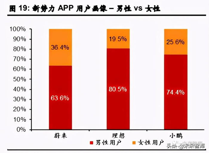从性别分布来看,蔚来汽车 APP 的男性用户比例为 63.6%,男女比例与理想/小鹏相比更为 均衡。对于理想汽车,其数据显示男性是其大部分用户群。在年龄分布方面,新势力 APP 用户主要集中在 26-45 岁之间。
