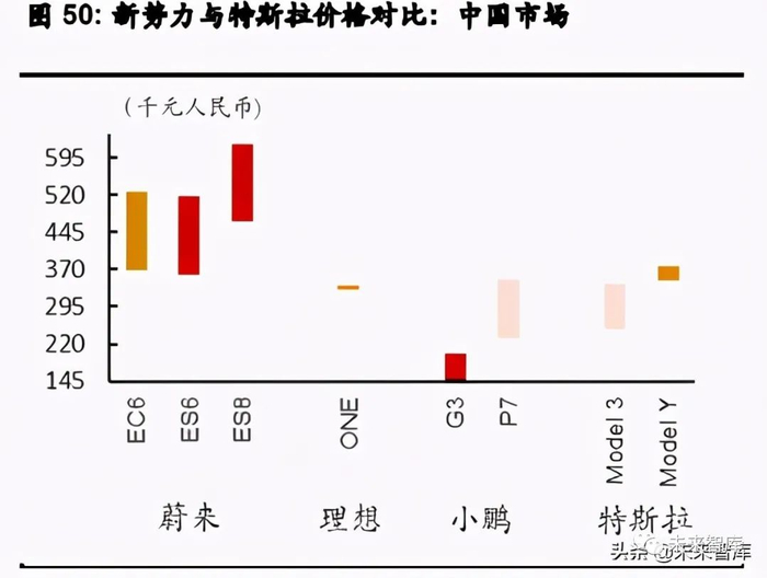 三家新势力创始人都曾经描述过自身企业对标的车企集团,但我们认为对标没有任何实质 意义,未来的发展空间主要是取决于看车型管线、价格带对比及技术方向等细节。