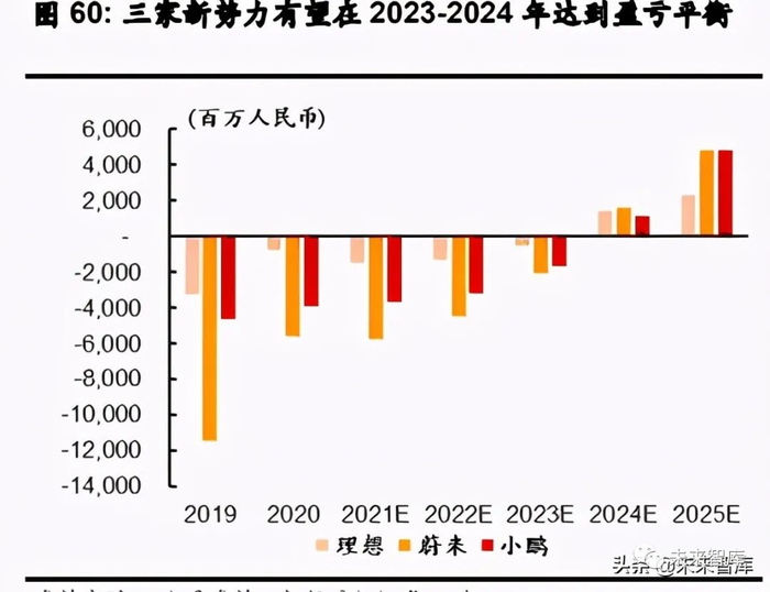 根据我们的销售和费用预测,我们预计三家新势力都将在 2024 年实现净利润盈亏平衡。鉴 于总体毛利率和费用控制前景更好,我们预计理想汽车将成为第一个达到盈亏平衡的造车 新势力。我们预计 2021-2023 年新势力的净亏损范围将在 5.85 亿元人民币至 57 亿元人民 币之间。