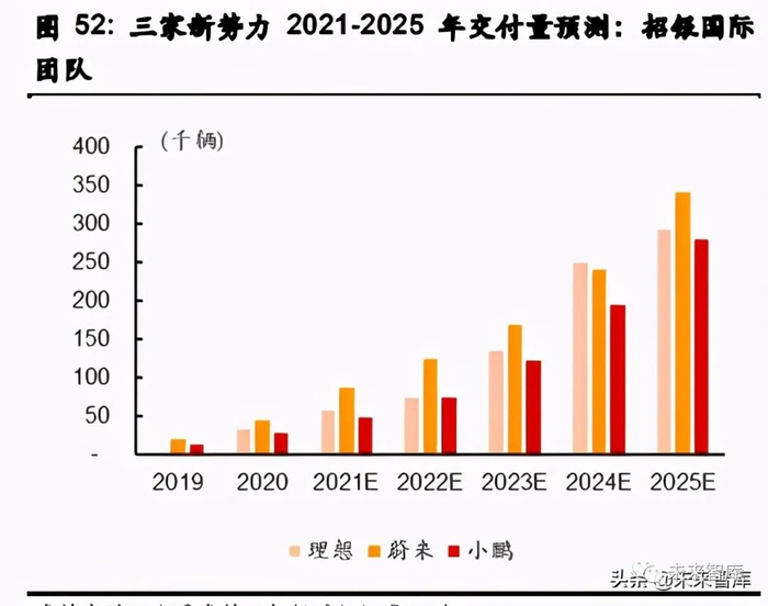 3)考虑到其豪华车定位(售价高 于小鹏汽车和理想汽车)以及高基数影响,蔚来汽车以相对较慢的速度增长,在 2021- 2025 年间复合年增长率为 40.6%。