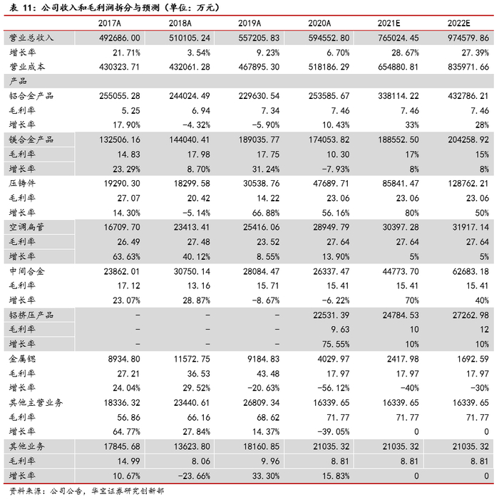 随着市场对轻材料轻量化的追求,更多汽车支架改换钢铁为镁铝,铝合金用量需求将有大幅增加。公司现有年产29万吨铝合金产能,铝合金化的周期较短,产能将扩张迅速,预计今年底增至40万吨。云信铝业年产10万吨铝中间合金项目一期工程5月底投产,中间合金的销售量将稳步上涨。东屏铝合金项目、山东云信的铝中间合金项目等预计均在21年年底建设完成,明年一季度放量。预计21/22年营收增长率达33%/28%。