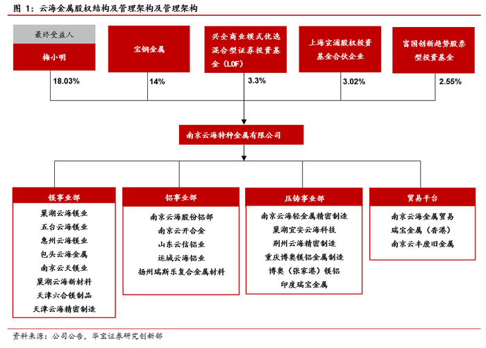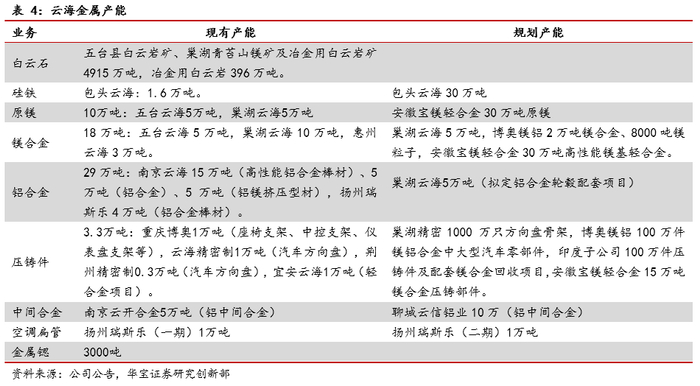 目前,公司有4个事业部:1)镁事业部,包括巢湖云海镁业、五台山云海镁业、惠州云海镁业、包头云海金属;2)铝事业部,包括南京云海股份铝部、扬州瑞斯乐、南京云开合金、山东云信铝业、运城云海铝业;3)压铸事业部,包括南京云海精密制造、荆州精密制造、巢湖宜安云海科技、重庆博奥镁铝金属制造、印度瑞宝金属;4)贸易平台,包括云海贸易、香港瑞宝、印度瑞宝金属。产业布局方面,公司建立了三大镁合金供应基地:安徽巢湖云海主要面对长三角地区客户;山西五台云海主要面对中西部客户及出口,广东惠州云海主要面对珠三角客户。巢湖云海、五台云海是公司原镁生产基地。